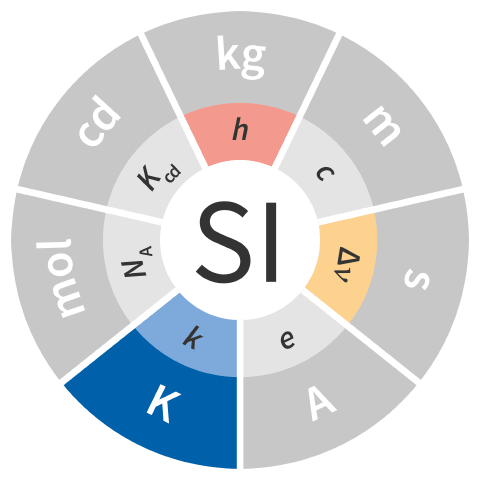 The kelvin, symbol K, is the SI base unit of thermodynamic temperature.The kelvin is defined by taking the fixed numerical value of the Boltzmann constant k to be 1.380 649 × 10−23 when expressed in the unit J K−1, which is equal to kg m2 s−2 K−1, where the kilogram, metre and second are defined in terms of h, c and ΔνCs. |